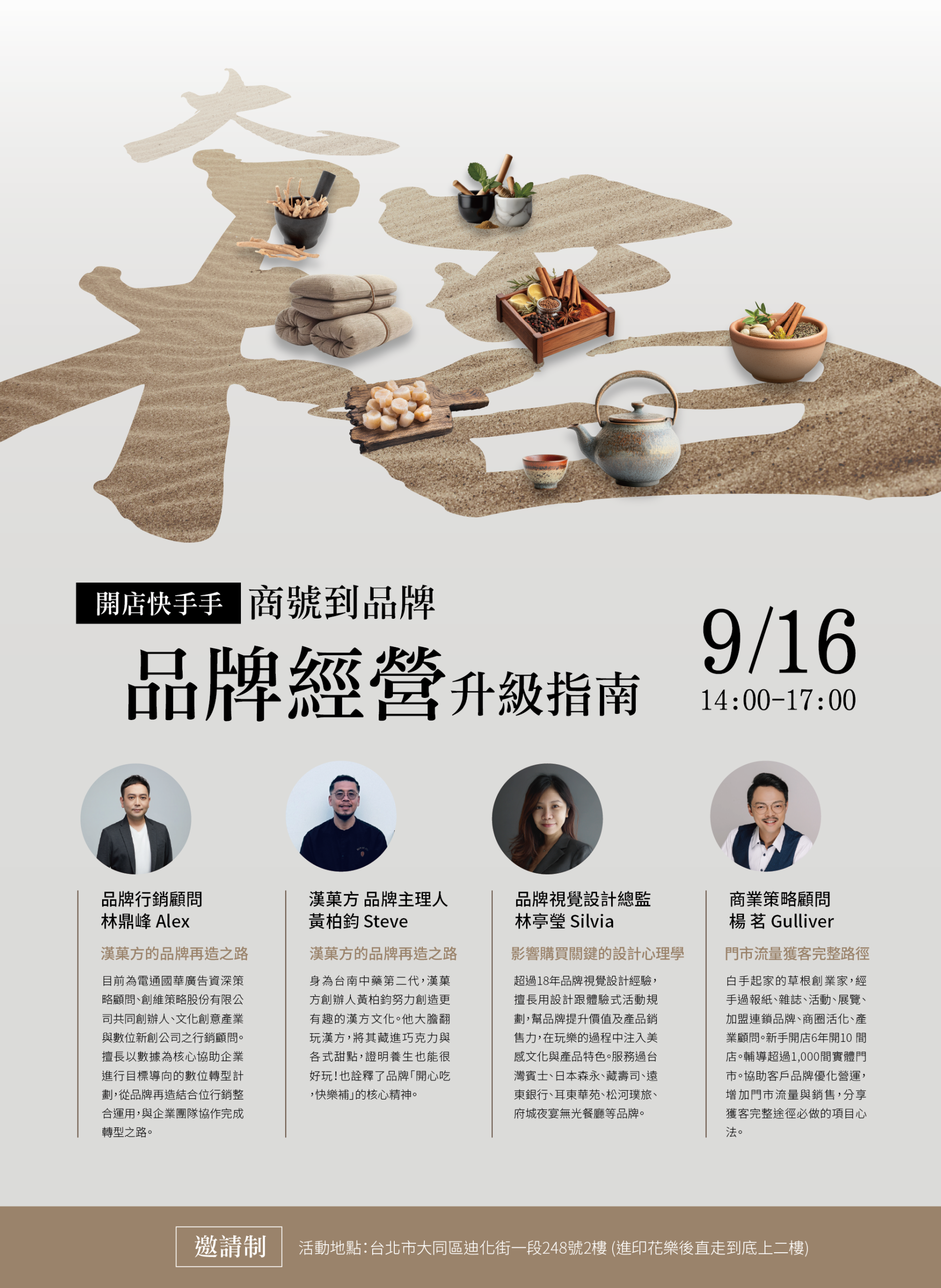 這次由 【開店快手手|專業品牌開店顧問團隊】 主辦,邀請 4 位不同領域的品牌高手,帶你從定位、設計到行銷,完整打通品牌經營脈絡: